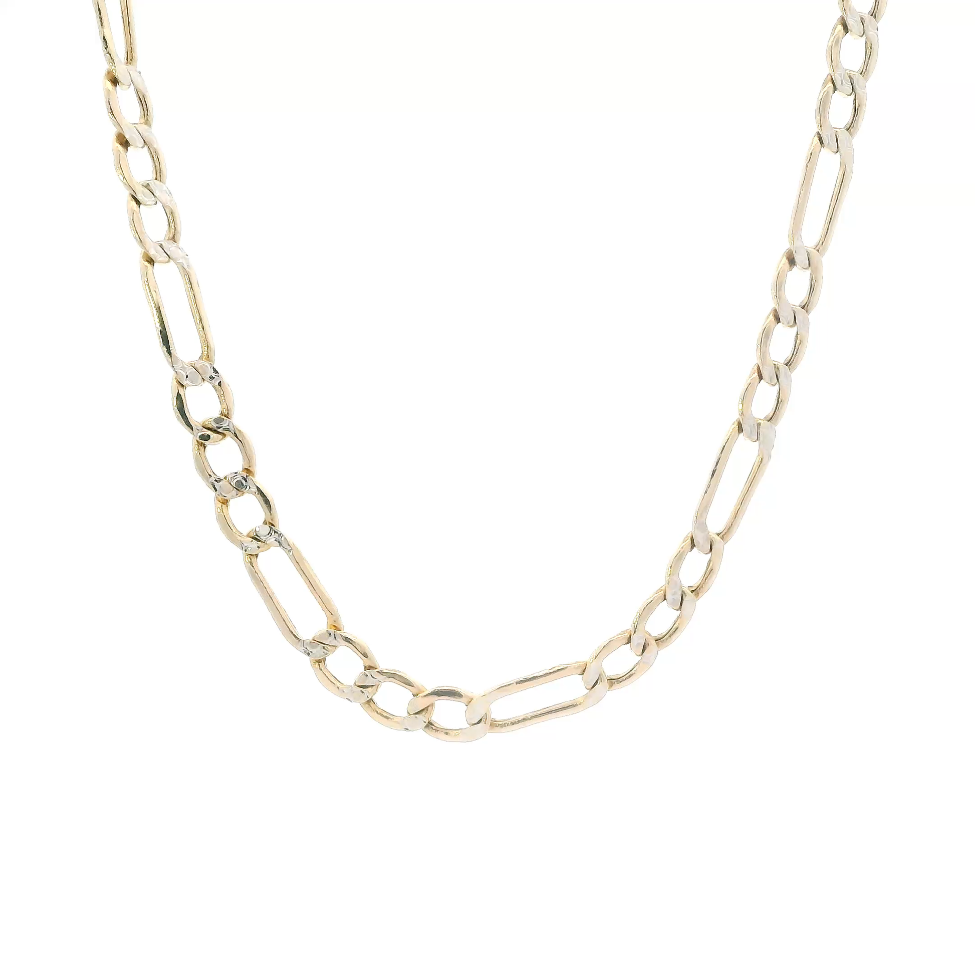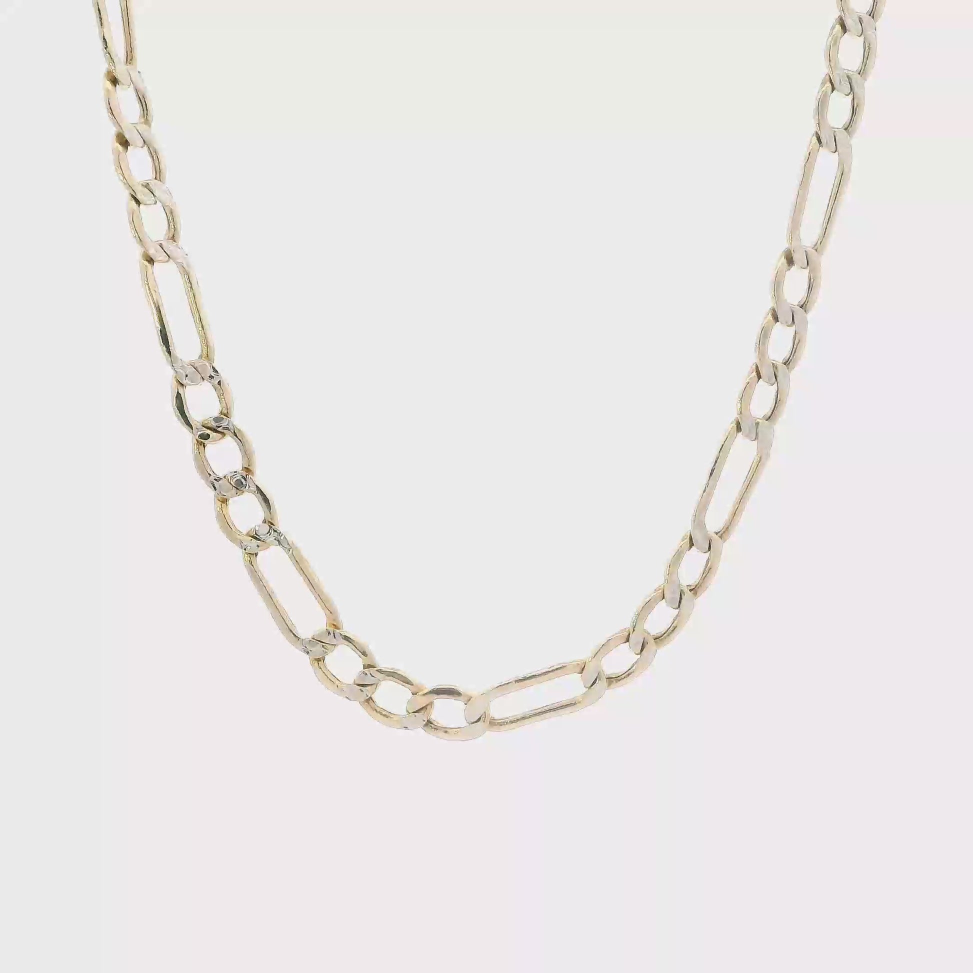 This is a beautiful gold diamond cut hollow figaro chain that is in clean preowned condition. It has been authenticated and polished by our in-house goldsmith.