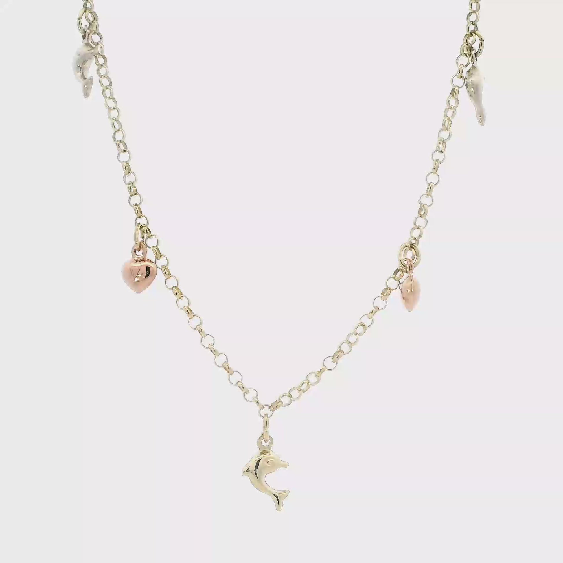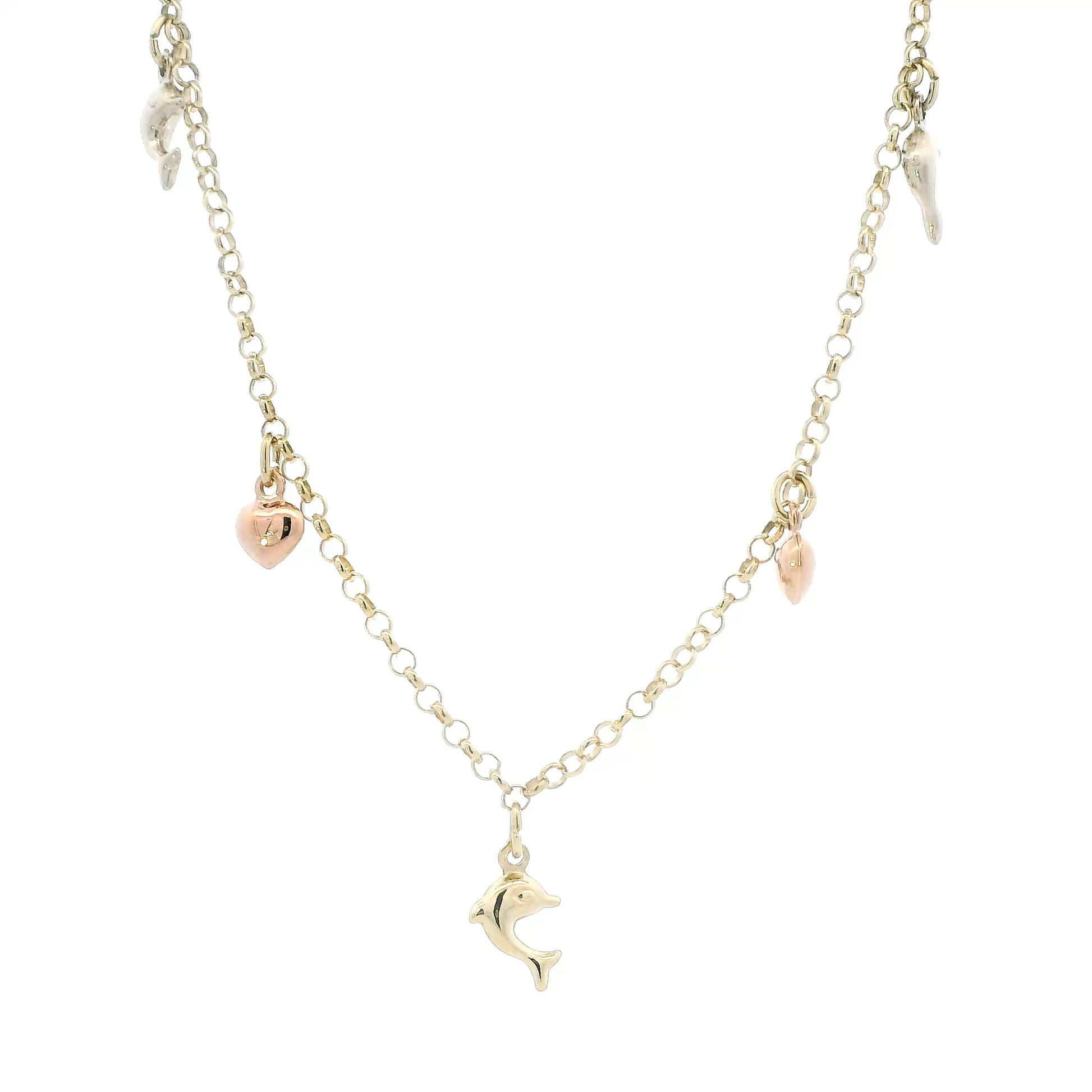 14K Yellow & Rose Gold 10" Dolphin & Heart Anklet